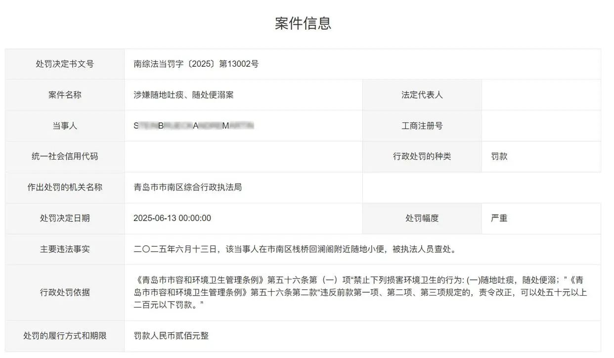 The Shinan District Law Enforcement Bureau imposed a 200-yuan fine, classifying the violation as “serious.” The penalty was enforced under Article 56, Item 1 of the Qingdao Municipal Regulations on City Appearance and Environmental Sanitation Management, which explicitly bans “spitting or urinating in public.” Additionally, the second paragraph of the same article mandates that violators of Items 1, 2, or 3 may be ordered to rectify their behavior and face fines ranging from 50 to 200 yuan.