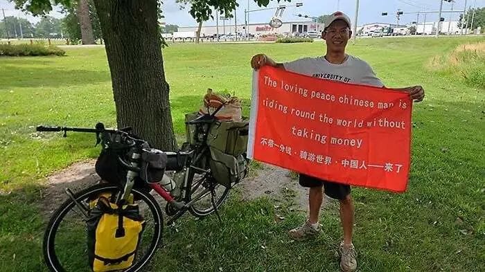 Remarkably, Xu has spent no money on this journey, except for flights and ferries over water. He refuses to take rides over land and relies entirely on the generosity of strangers for food, water, and shelter. While he often camps, there have been times when he’s needed more help, such as when he fell ill in Champaign, Illinois. There, a Chinese student from the University of Illinois took him in, gave him a shirt, and even set up an interview for him with a local news station, WCIA. It was the second media interview Xu had given on his trip.