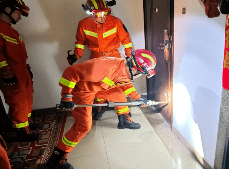 Firefighters arrived at the scene by 2:05 PM. They were informed that the caller would return home in 40 minutes, but the smart door lock had malfunctioned. Multiple attempts to enter the password failed, and the lock was secured from the inside, making it impossible to open without breaking it. With the caller’s consent, Incident Commander Ji Xiongjun directed the team to use tools such as crowbars, a cutting machine, and hydraulic equipment to force the door open.