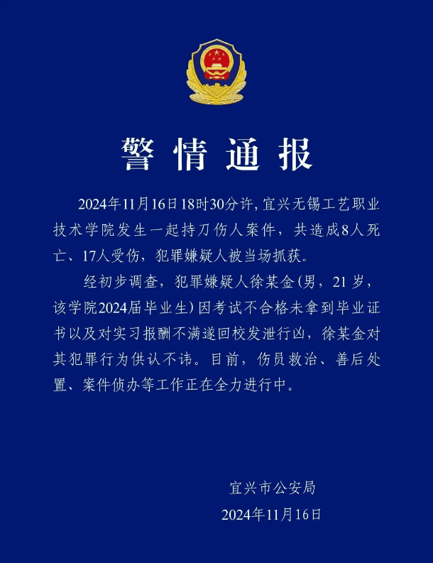The incident took place at around 6:30 p.m. at the Wuxi Vocational Institute of Arts and Technology in Yixing. A man attacked individuals with a knife, resulting in eight fatalities and 17 injuries. The suspect was apprehended at the scene, according to the Yixing Public Security Bureau.