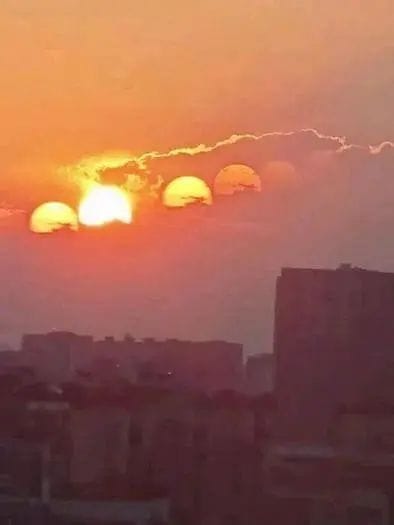 Much like seeing a reflection in a mirror, the light was refracted and reflected off the layers of the glass, with each layer producing a duplicate of the sun’s image. The brightest sun in the center was the real one, while the others were part of the optical illusion.